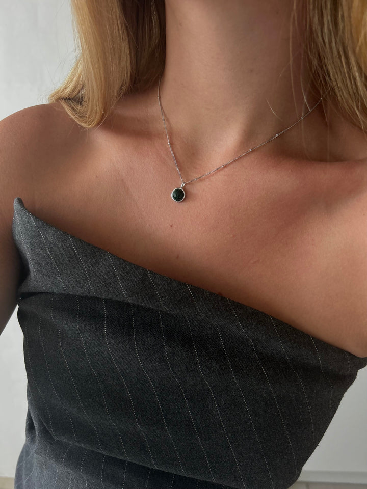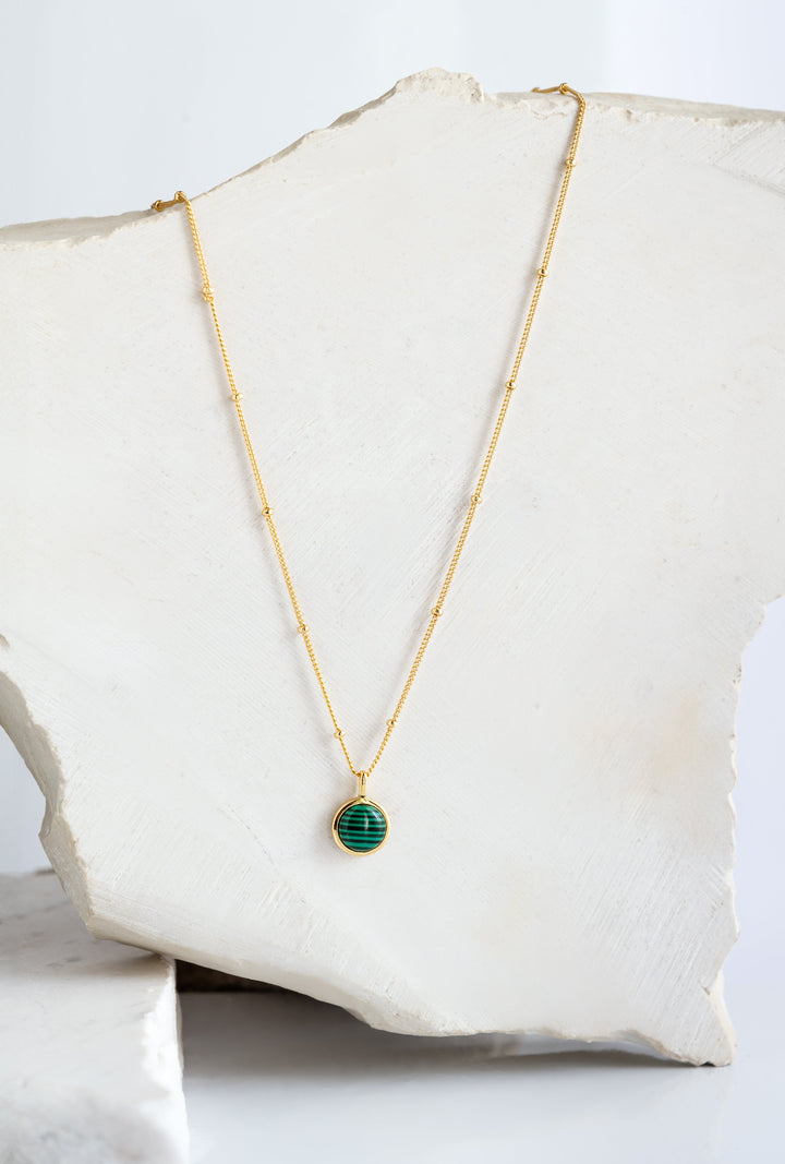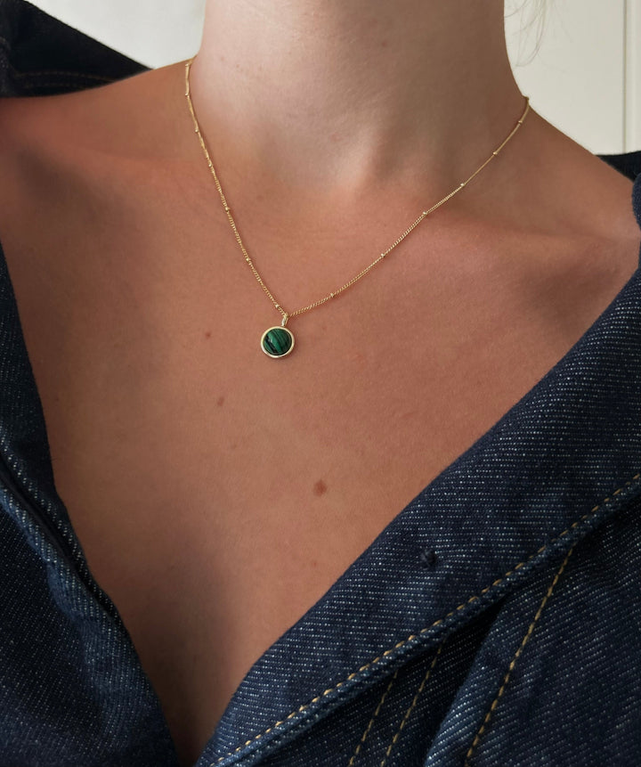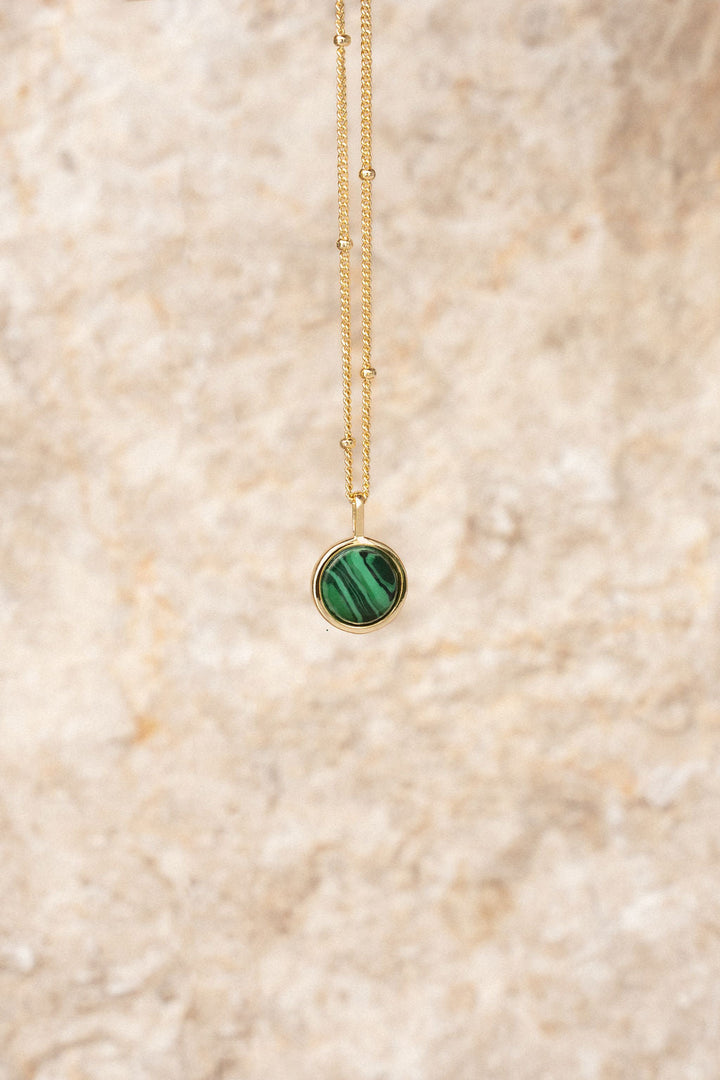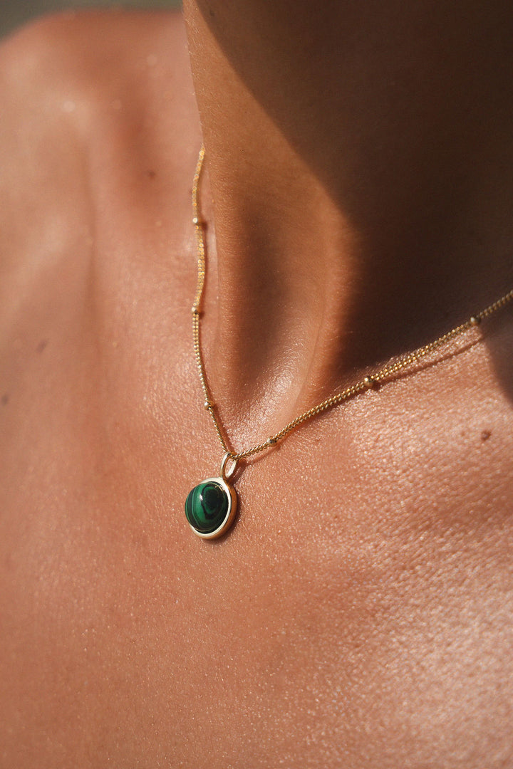 An inspired full moon necklace with a centered malachite pendant, our Hazèl necklace is designed to connect you to nature and radiates your full beauty from within. The delicate satellite beads in gold or silver round up the delicate finish with its unique design.