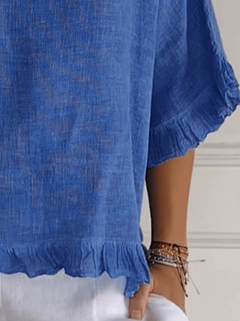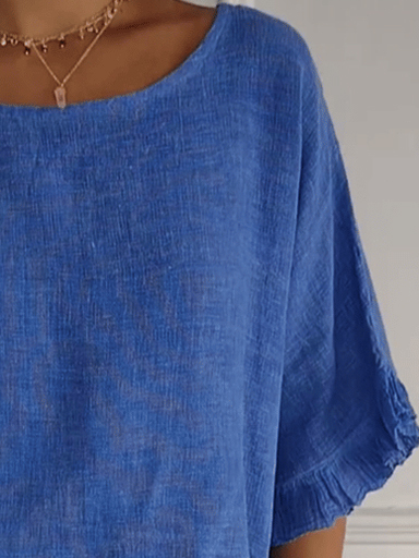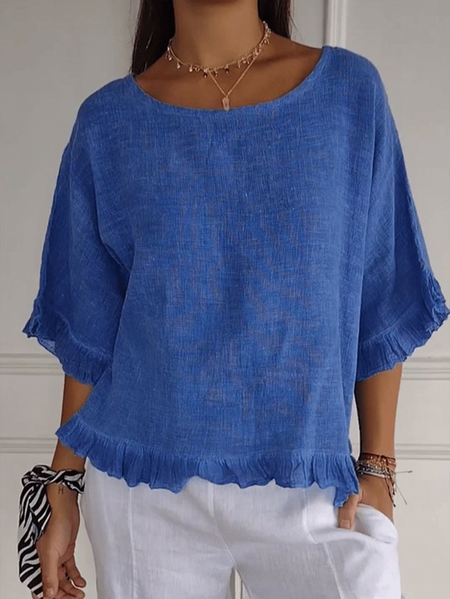 Elevate your summer style with our Women's Half Sleeve Shirt. This Blue Plain Ruffle Cotton Top features a Crew Neck and Dolman Sleeves. Its simplicity and daily comfort make it a wardrobe essential for any casual look.