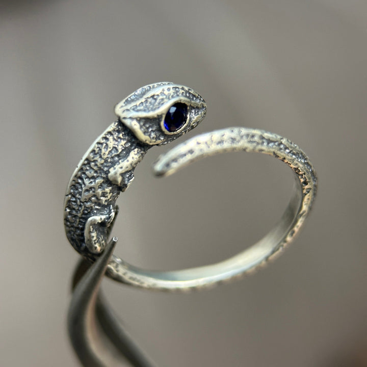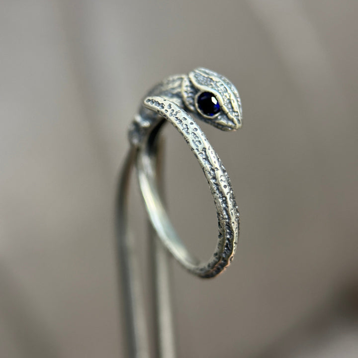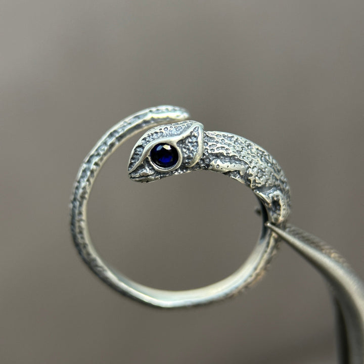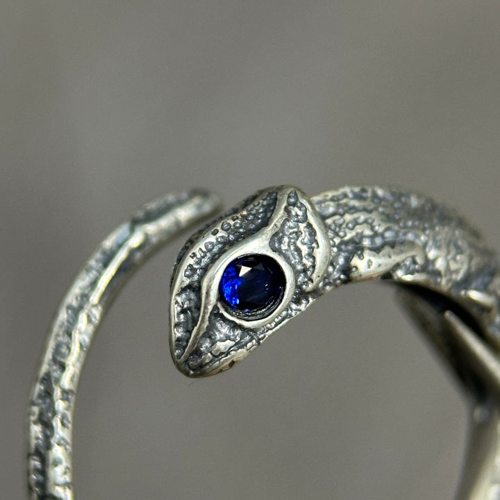 Crafted with precision and inspired by the desert’s fiercest survivor, this lizard ring is a testament to resilience and adaptability. The sapphire-blue stone reflects light with a mysterious glow, while the silver scales add a touch of rugged elegance. Whether worn as a personal talisman or a statement accessory, this ring tells a story of strength and transformation.