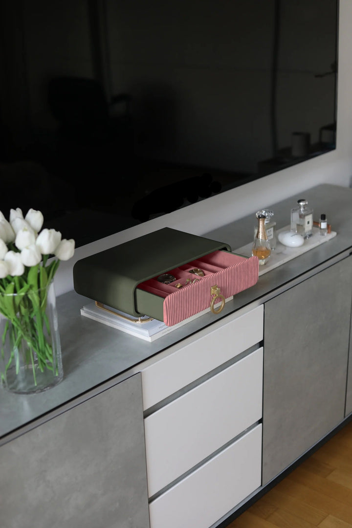 This jewelry box is built to last, with quality materials and careful craftsmanship. Choose Olive & Pink to match your style and blend with your vanity space’s decor.