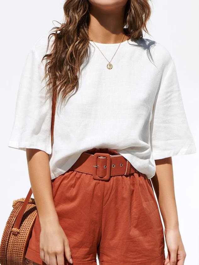Women's Short Sleeve Blouse Summer Plain Buckle Cotton Crew Neck Daily Going Out Casual Top White