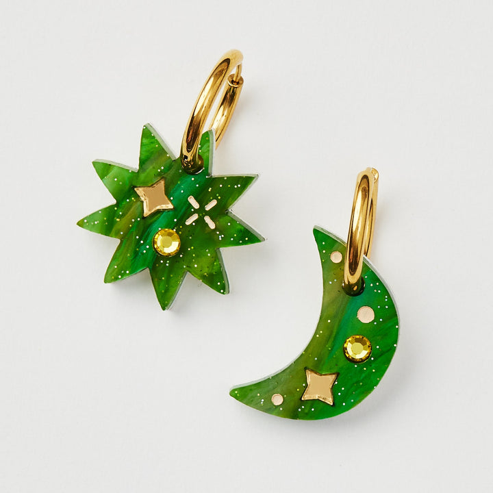 Embrace the cosmic charm with this playful duo – one featuring a sparkling star and the other a shimmering crescent moon. Adorned with twinkling motifs and a dazzling crystal inlay, these earrings add a touch of whimsy to your style. Embrace your individuality and let your accessories shine as bright as the stars themselves!