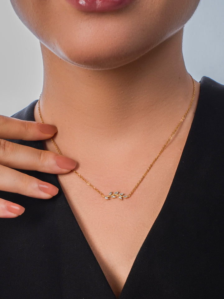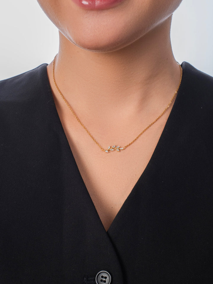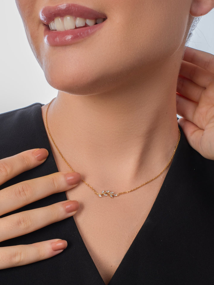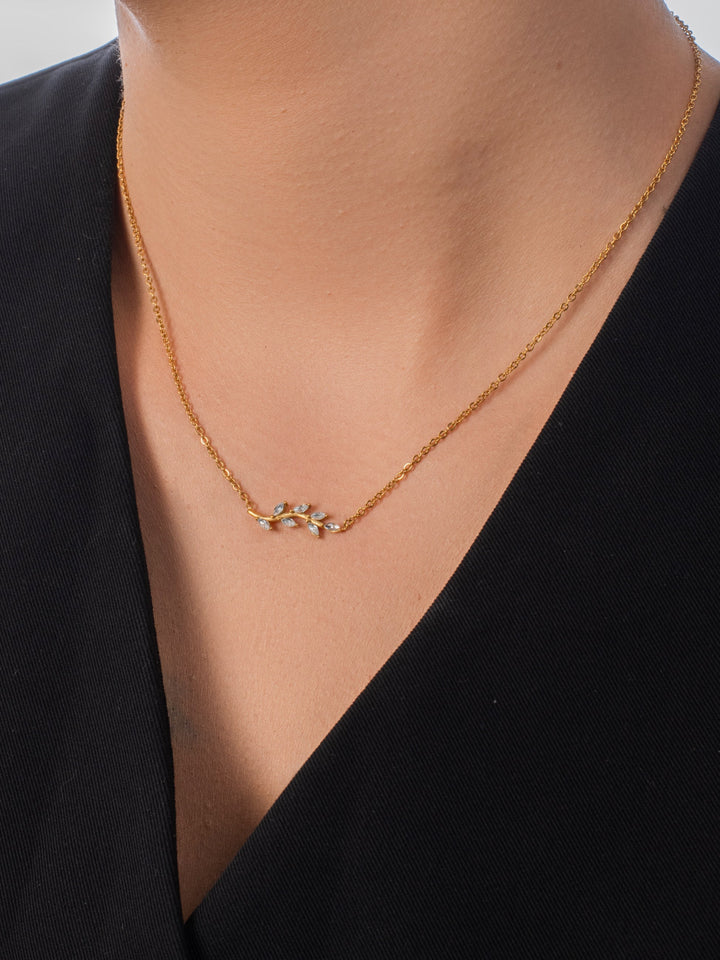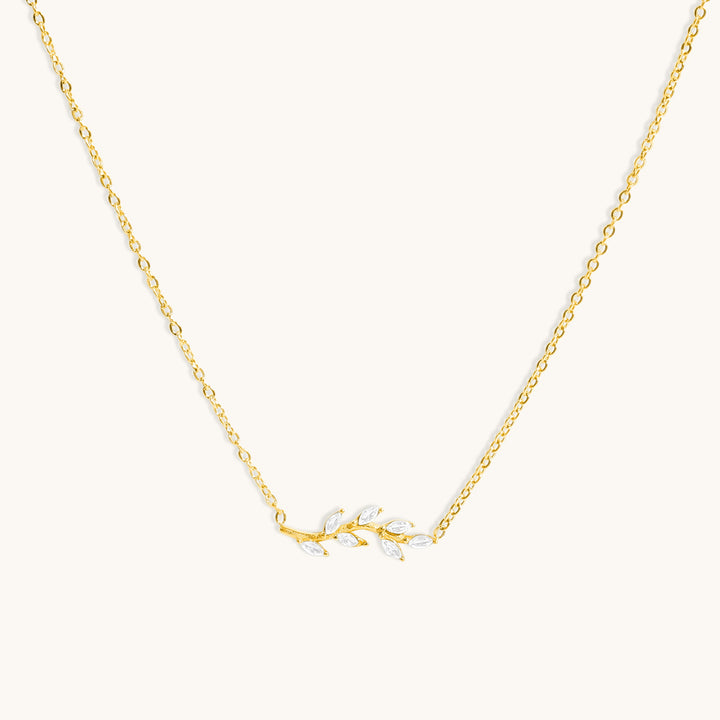 The Lily Necklace features a delicate branch design adorned with shimmering leaves, perfect for adding a touch of nature-inspired elegance to your look. Its refined and graceful style complements any outfit, making it ideal for everyday wear or special occasions.